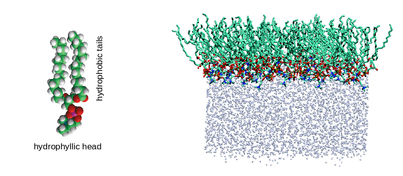 Surfactants are a class of materials, for example soaps or detergents or fatty acids, that have a two-part molecular structure where one part is attracted to water and the other part is not. As a result, these materials form thin layers at the surface of water which can reduce the surface tension of water. Consider the zwitterionic molecule DPPC (left image). The polar head group is attracted to the polar water molecules while the two non-polar hydrocarbon tails are entropically repelled by water molecules. At the surface of water, DPPC forms a layer that is a single molecule thick (right image) and acts like a two dimensional material.