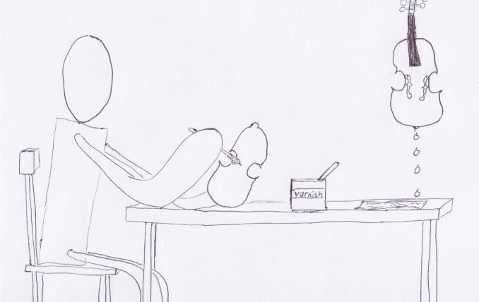 The meticulous varnisher: A violin maker applies surfactant based varnish to a violin while a second instrument hangs to let the varnish dry. Varnish serves the two fold task of encasing and protecting the wood and enhancing the visual qualities of the wood. The varnish coating also affects the accoustics of the wood; however, because of the wide range of varnish preparation methods, the precise effects and best methods are debated among luthiers. Many varnishes, as with many paints and inks, contain fatty acids (a class of surfactants). These surfactants contribute to the coating's chemical and mechanical properties as well as the structure of the varnish.